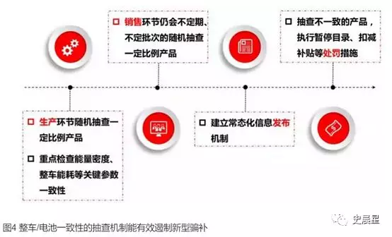 针对少数车企有可能采取“优劣参半”的方式生产产品、摊销成本、骗取补贴,四部委建立整车和电池一致性抽检制度、建立新能源汽车安全事故统计、审查、处罚机制。